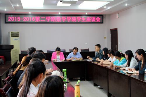 5月18日、19日下午,数学学院在数学楼会议室分别召开了2015―2016学年数学专业学生座谈会和公共数学课程学生座谈会,数学学院党委副书记何永,公共数学课程授课教师潘虹等领导老师出席座谈会,数学学院30余名学生代表和来自计算机学院、城环学院、生科院等院系的20余名学生代表参加座谈会。座谈会由潘虹主持。