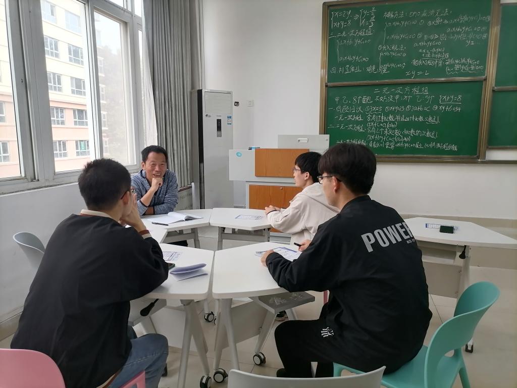 在404室,张青海老师指导匡宇、段一宇和刘瑞霞三位学生。匡宇同学试讲七年级《二元一次方程式》。段一宇同学讲了七年级的《绝对值》一课。刘瑞霞同学讲了九年级数学《一元二次方程》一课。张青海老师对三个同学的讲课给予了指导。从上台的仪表仪容,到上课的各个环节;再到上课的语言技巧,讲课技巧,提问技巧,小组活动的组织和开展等作了评析,三个学生不断点头,在笔记本上认真记录。其它的每个组都进行得如火如荼,讲课的学生全力以赴,评析的老师一丝不苟。