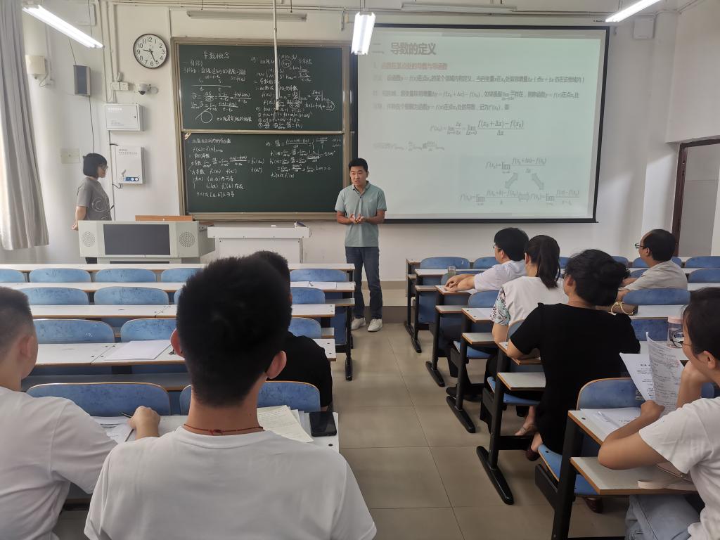 8月27日,先后开展了两个阶段的培训活动,参加人员为近三年新入职教师。第一阶段,由学院邀请的在教学及教学指导方面均具有丰富经验的、上一届督导组组长秦金华老师作题为《数学分析课程中的反例——处处连续处处不可导函数》的教学观摩示范课。秦金华老师从“勤”、“学”、“善”、“悟”的教学心得入题,向大家展示了一节课的完整教学过程,尤其在内容设计、课堂节奏、语言表达、语速快慢、板书内容、师生互动、数学史及数学知识关联等方面,向青年教师诠释了数学课讲授过程中的精准把控,为青年教师指明了今后教学技能的提高方向。