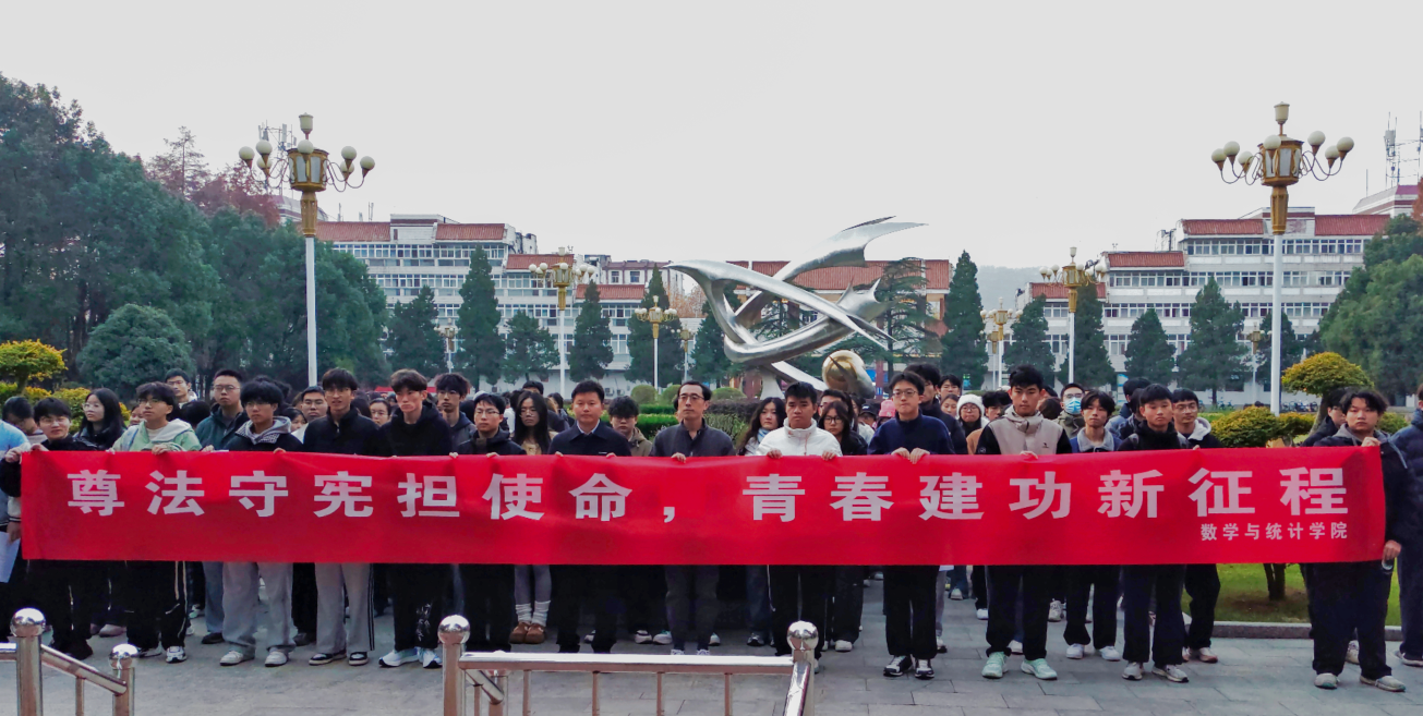 12月1日清晨,数学与统计学院在明德广场举办“尊法守宪担使命,青春建功新征程”主题升国旗仪式。学院党委副书记葛文鹏,辅导员吴成熙以及学生代表共170余人参加活动。