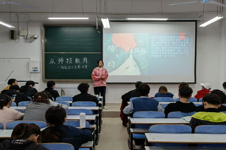 通过初赛角逐,12位选手进入决赛现场。首先,主持人宣读了本次比赛的规则及评分标准。比赛开始,各位选手都准备充分,从海报主题的灵感来源、海报风格的确定、海报制作的手段及完成设计后的收获、感想等方面进行了细致的介绍,海报设计都主题鲜明、寓意丰富,展现了作为一名设计者的精神面貌。期间各位评委都认真负责,对学生的作品提出了宝贵的指导意见。最后,经过紧张的评分环节,张进同学荣获第一名,她的作品以“引路前行”为主题,选取了灯塔对老师的比喻,学生在老师的粉笔字中汲取知识,老师成为学生的灯塔与引路人,更加突出本次“从师技能月”的活动主题。获得了评委们的一致好评。