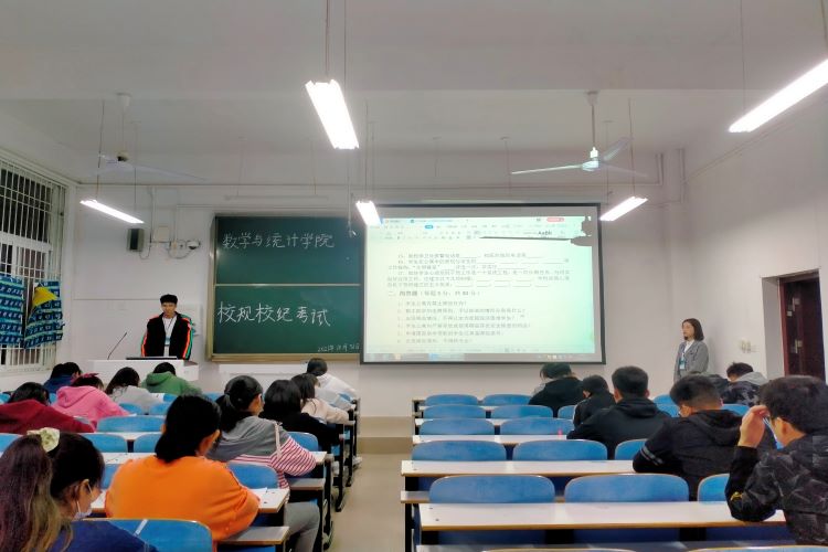 为全面配合我院校纪校风建设工作,同时进一步促进学生管理工作的良性开展,数学与统计学院于10月31日晚上7:00-9:00在数学楼固定教室以班级为单位进行了数学与统计学院2021级学生校规校纪考试。