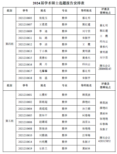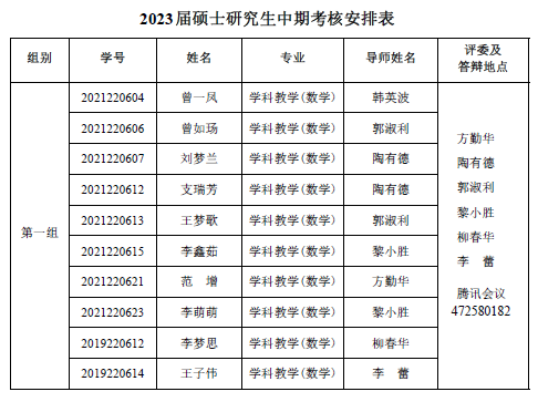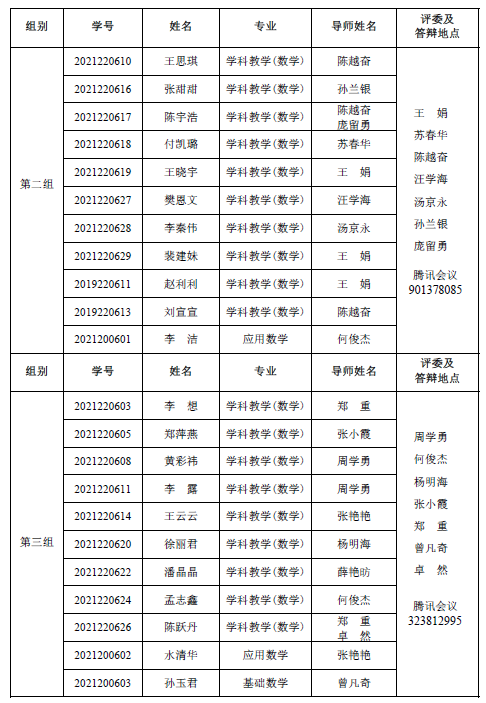 数学与统计学院 2022-2023 学年第一学期 2021级专业硕士研究 生(两年制专业硕士)、2021 级同等学力研究生、2019 级硕师计划研 究生学位论文中期考核和 2021 级学术硕士研究生(三年制学术硕士)学位论文选题报告答辩会定于 2023年 1月 6日14:30—18:00在腾讯会议平台举行,具体分组见下表。参加答辩的同学需提前填写好《信阳师范学院硕士研究生学位论文选题报告》或《信阳师范学院硕士研究生中期考核表》,并按照选题报告或中期考核所列内容准备 12 分钟左右的汇报课件参加答辩,届时不参加答辩的同学视为考核不通过。