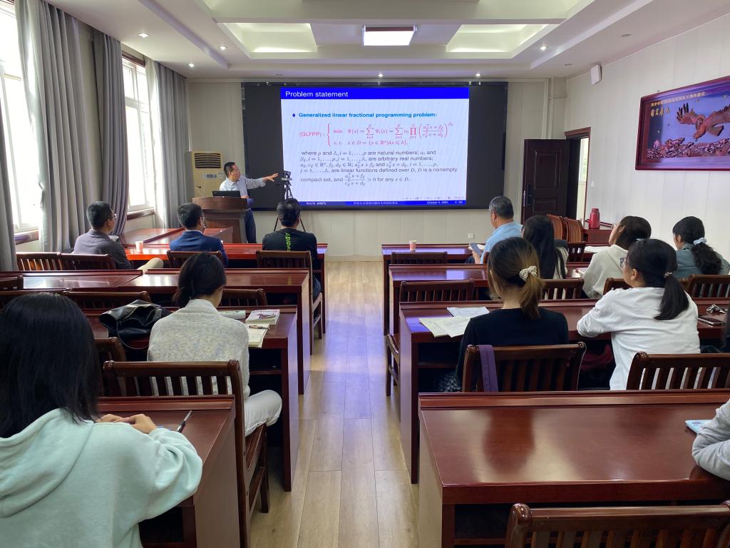 10月5日上午,应数学与统计学院邀请,河南科技学院焦红伟教授作了题为《Global optimization methods for the minimax linear fractional programming problems》的学术报告。报告会由韩英波教授主持,部分老师及研究生聆听了此次报告