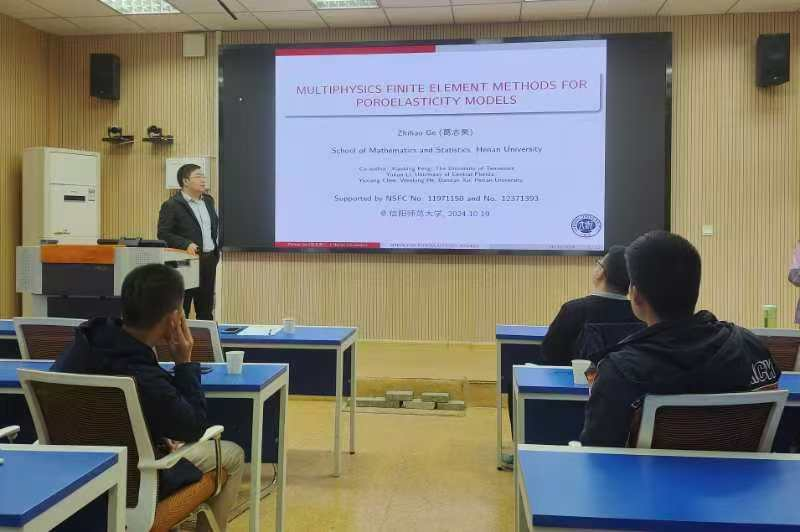 10月19日上午,应数学与统计学院邀请,河南大学葛志昊教授作了题为《MULTIPHYSICS FINITE ELEMENT METHODS FOR POROELASTICITY MODELS》的学术报告。报告会由李世顺教授主持,部分老师及研究生聆听了此次报告。