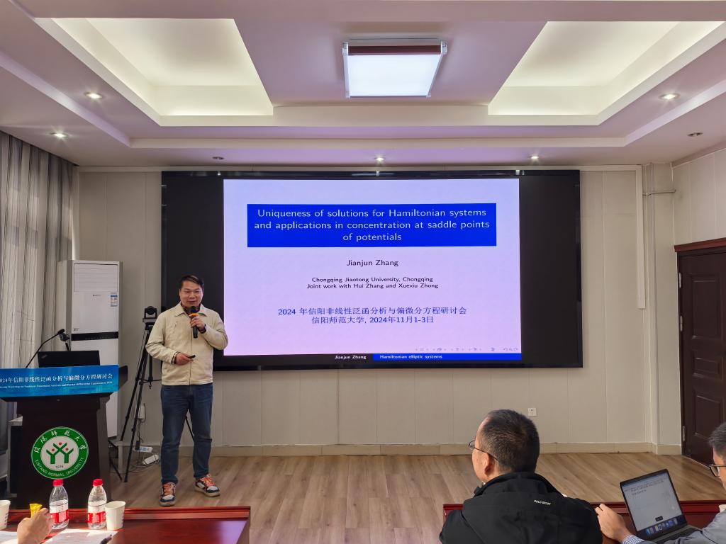3场报告由重庆交通大学的张建军教授作了题目为《Uniqueness of solutions for Hamiltonian systems and applications in concentration at saddle point of potentials》的学术报告。