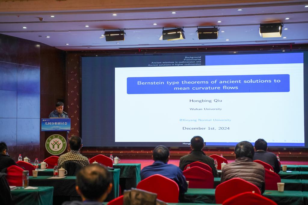 邱教授在这次报告中,介绍了平均曲率流的古典解的伯恩斯坦型结果。首先给出在最优增长条件下余维数为1的古典解的刚性结果。然后通过进行精细的曲率估计,证明在多种Gauss图像限制下,更高余维数的平均曲率流的完备非紧致古典解的更好的刚性定理。