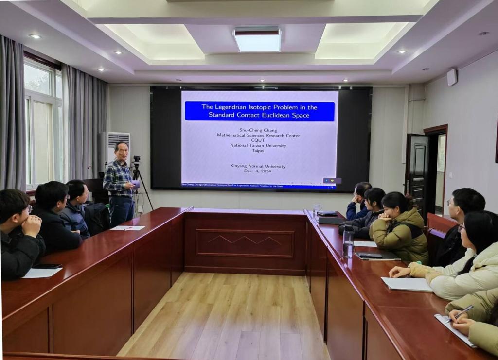 12月4日上午,应数学与统计学院邀请,台湾大学/重庆理工大学张树城教授作了题为《The Legendrian Isotopic Problem in the Standard Contact Euclidean Space》的学术报告。报告会由韩英波教授主持,部分教师及研究生聆听了此次报告。