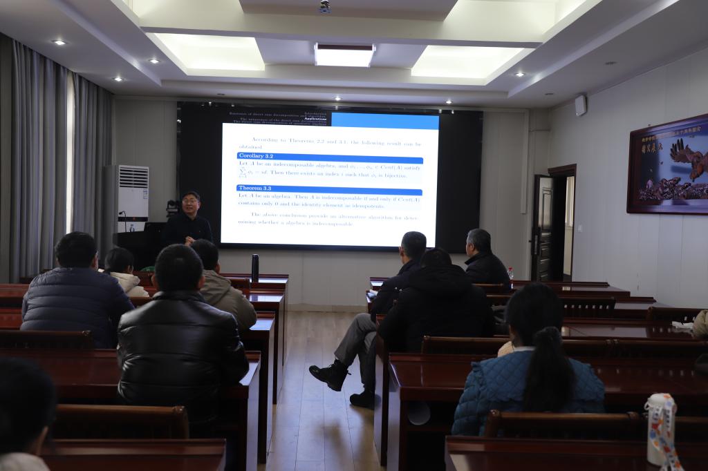 12月27日上午,应数学与统计学院邀请,东北师范大学陈良云教授在数学楼315会议室作了题为《Direct sum decomposition of (quadratic) algebras》的学术报告。报告会由韩英波教授主持,代数团队的部分教师及研究生聆听了此次报告。