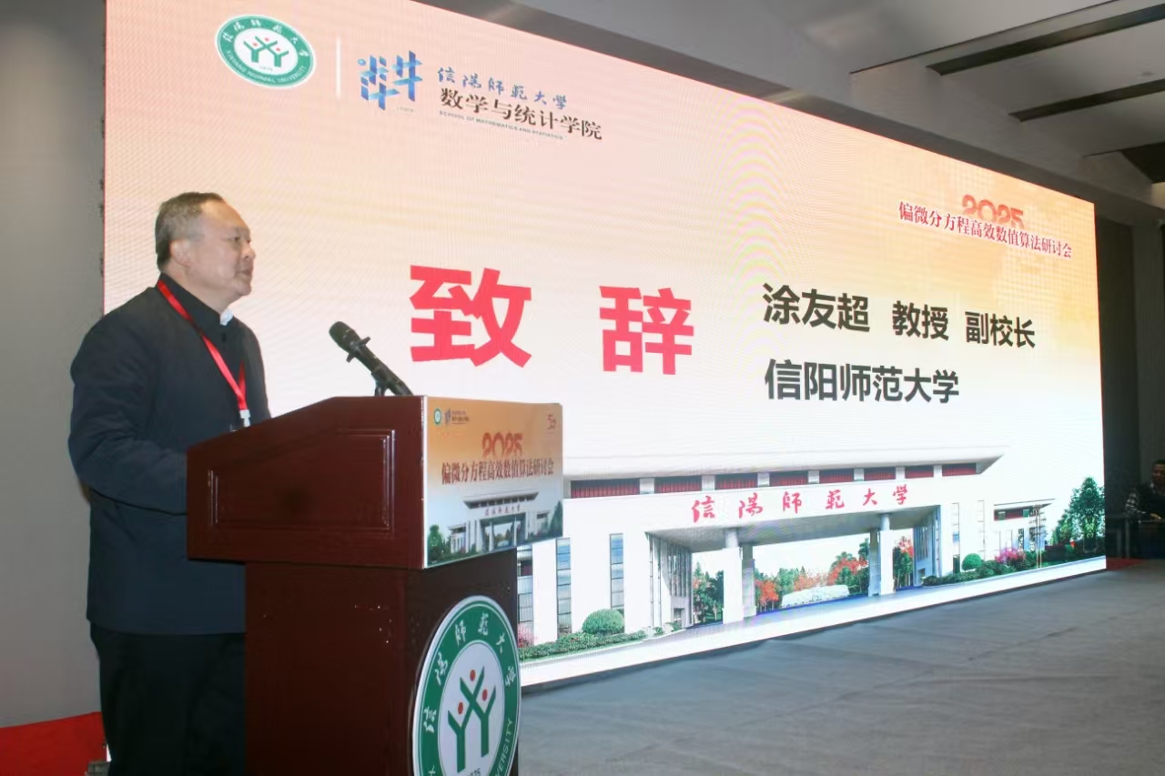 涂友超代表学校致欢迎辞,向出席会议的专家学者表示热烈欢迎,向支持我校发展的专家学者表示衷心感谢,简单介绍了学校的基本情况和近年来建设高水平师范大学方面所取得的成就。重点介绍了我校计算数学团队近年来取得的成绩和未来发展规划。涂友超强调数学学科作为信阳师范大学优势学科,一直受到学校的高度重视与重点支持。当前学校数学学科正处于申报博士点、实现跨越式发展的关键时刻,希望与会专家学者对我校数学学科建设提出宝贵意见和建议,加强交流与合作,推动我校数学学科快速发展,助力博士点培育建设。预祝本次研讨会取得圆满成功,期待通过此次盛会,携手共创数学研究的新篇章。学术委员会成员陈荣亮研究员致辞,对偏微分方程高效数值算法研讨会的召开表示热烈祝贺,对信阳师范大学数学与统计学院高度重视、精心组织和辛勤工作表示感谢,对各位专家的大力支持表示感谢。对我校近年来取得的办学成就和数学与统计学院计算数学团队取得的科研成果给予了高度评价。