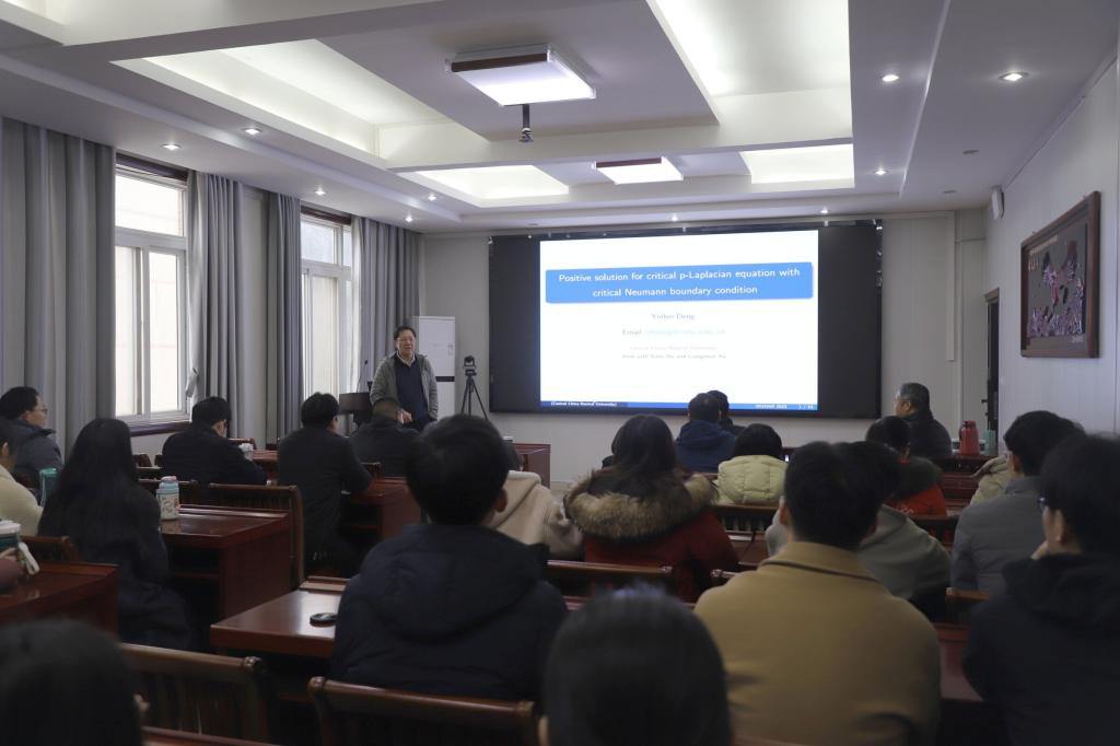 2月22日下午,应数学与统计学院邀请,华中师范大学邓引斌教授在数学楼315会议室作了题为《Positive solution for critical p-Laplacian equation with critical Neumann boundary condition》的学术报告。报告会由数学与统计学院院长蔡礼明教授主持。副院长韩英波教授、偏微分方程团队的部分教师及研究生参加了此次报告会。