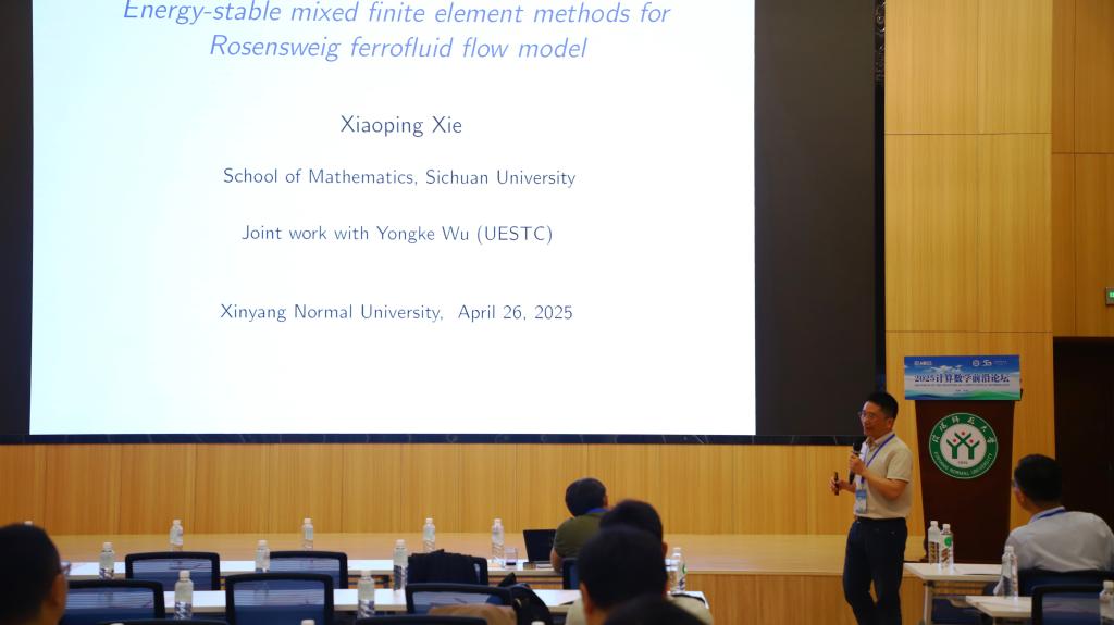第3场由四川大学谢小平教授作了题目为《Energy-stable mixed finite element methods for the Rosensweig ferrofluid flow model》的学术报告。