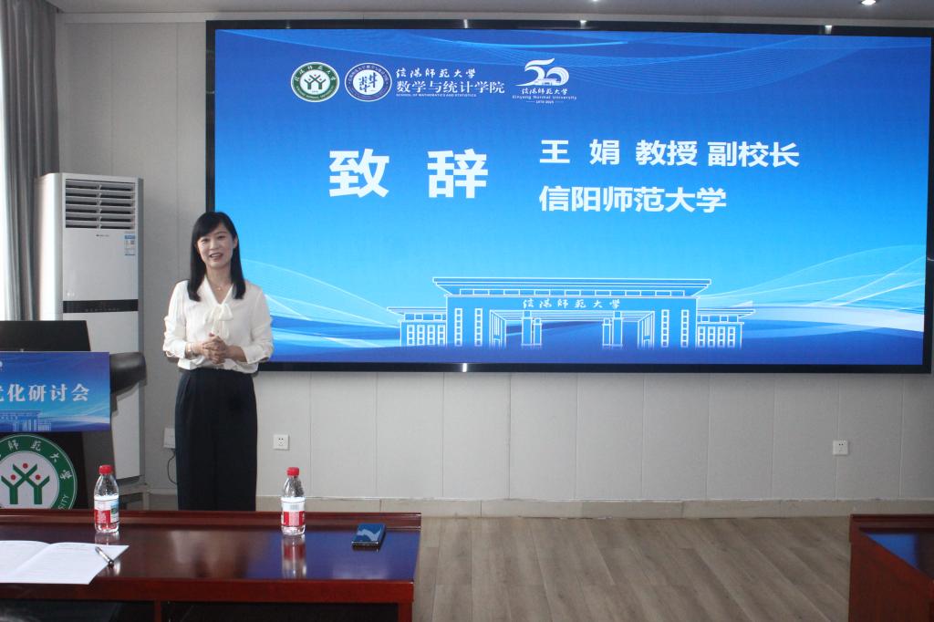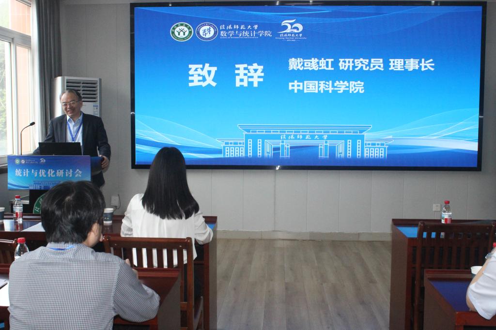 中国数学会副理事长、中国运筹学会理事长、亚太运筹联合会主席、中国科学院数学与系统科学研究院副院长戴彧虹研究员致辞,对统计与优化研讨会的召开表示热烈祝贺,对信阳师范大学数学与统计学院的高度重视、精心组织和辛勤工作表示感谢,对各位专家的大力支持表示感谢,同时对我校近年来取得的办学成就和运筹优化团队取得的科研成果给予了高度评价。