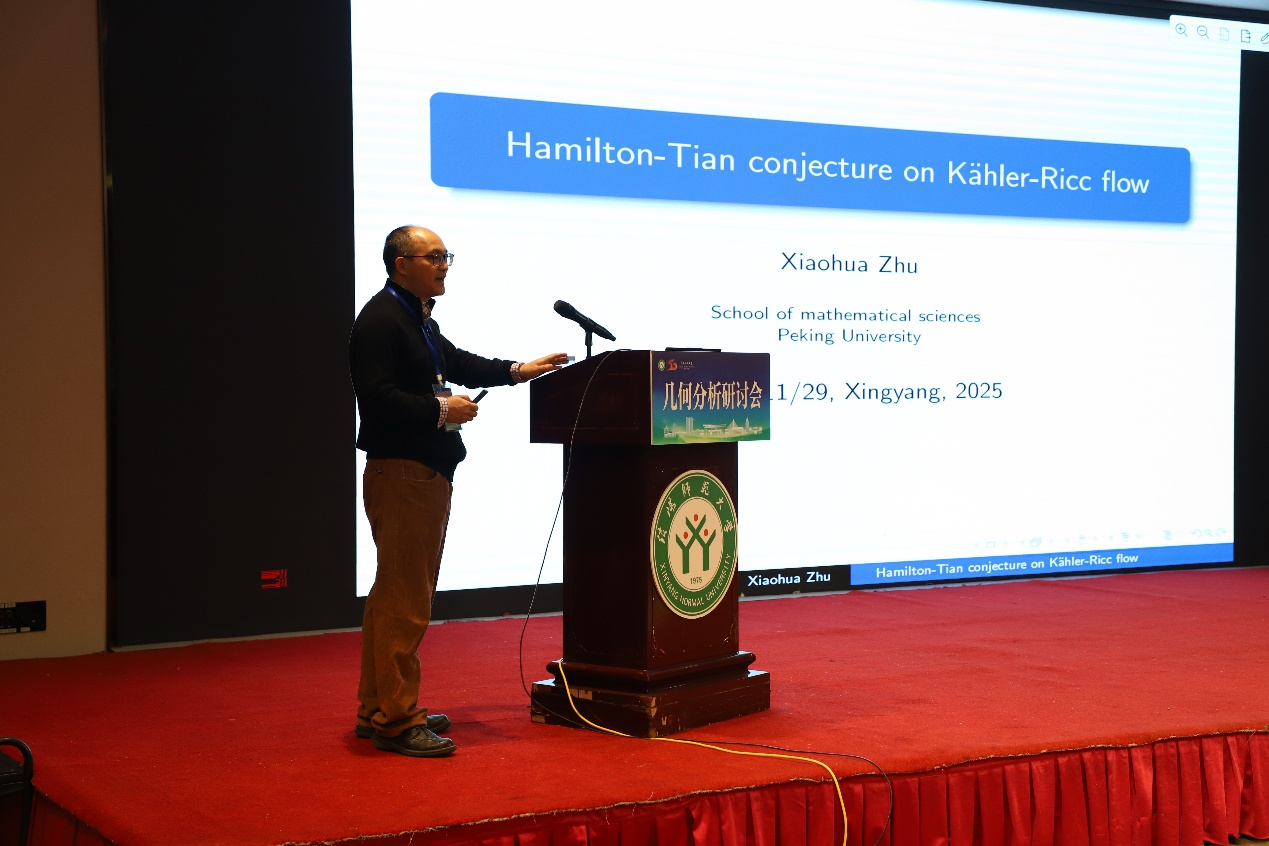 第一场报告由北京大学朱小华教授带来,题为《Hamilton-Tian conjecture on Kaehler-Ricci flow》。本场报告由中国科学院数学与系统科学研究院/广州大学的王友德教授主持。朱教授系统回顾了近二十年来关于法诺流形上凯勒–里奇流中 Hamilton–Tian猜想的研究进展,并重点介绍了一种研究该问题的新思路——借助带Bakry–Émery 里奇曲率的共形几何方法。