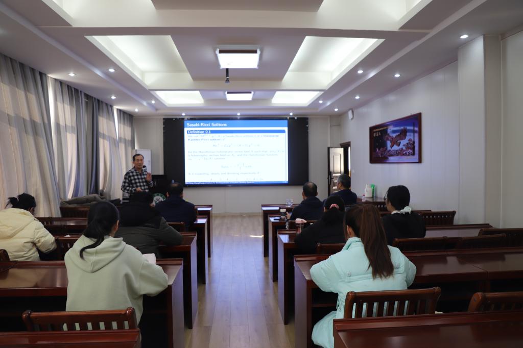 2025年12月1日,上海数学与交叉学科研究院、台湾大学张树城教授受邀做客信阳师范大学,在数学楼315学术报告厅作了题为“Classification of Gradient Shrinking Sasaki-Ricci Solitons of Dimension Five”的学术报告。报告会由数学与统计学院副院长韩英波教授主持,部分老师及研究生聆听了此次报告。