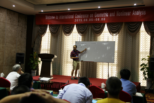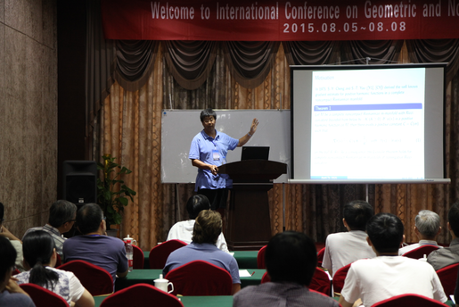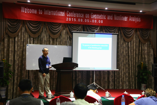 第二场学术报告由台湾中央研究院郑日新教授主持。美国佐治亚大学贴经智教授作了题为《Yau’s Gradient Estimate and Liouville Theorem for Positive Pseudohermonic Functions in a Complete Pseudohermitian manifold》的报告,他将丘成桐著名的梯度估计推广到了CR情形,建立了拟调和函数的水平梯度估计,以此得到了Liouville定理,同时,也得到了一类CR情形的比较定理,这在CR几何中将会发挥重要作用。