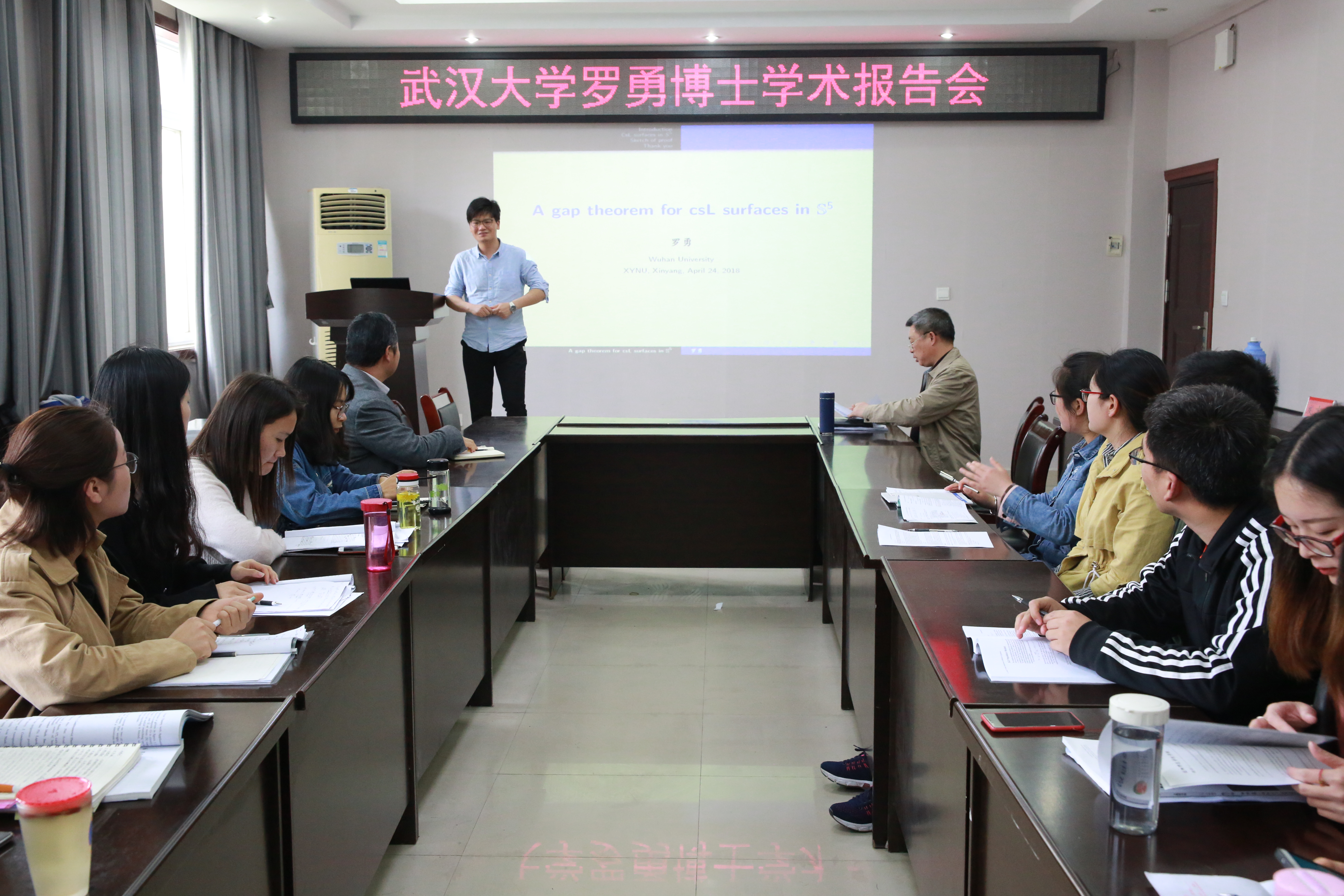 2018年4月24日下午,应数学与统计学院邀请,武汉大学罗勇博士在数学学院院学术报告厅作了题为“ A gap theorem for csl surfaces in five dimensional sphere”的学术报告,报告会由数学与统计学院院长胡余旺教授主持,该院的部分教师和研究生聆听了此次报告。