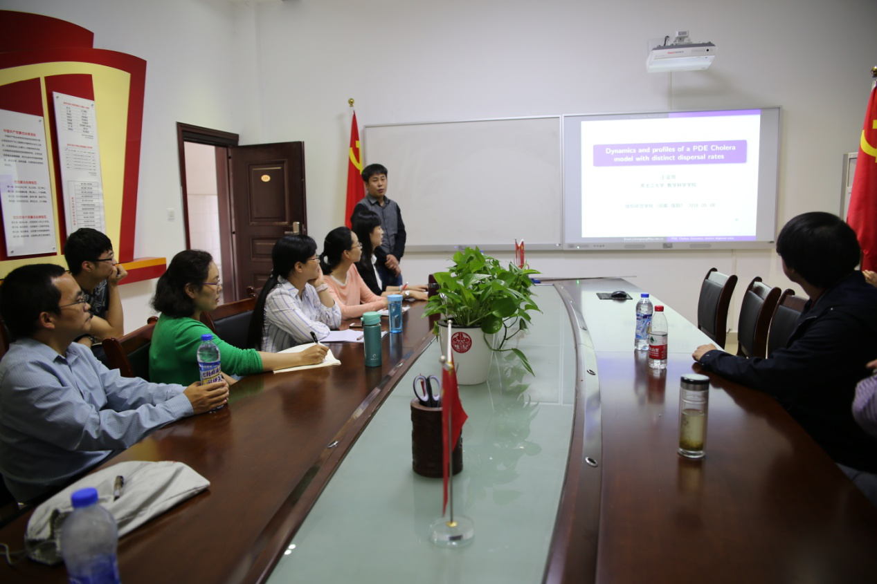 2018年5月8日下午,应数学与统计学院邀请,黑龙江大学王金良教授在数学学院党员之家作了题为“Dynamics and profiles of a PDE Cholera model with distinct dispersal rates”的学术报告。报告会由数学与统计学院党委书记王娟副教授主持,学院部分教师、研究生聆听了此次报告。
