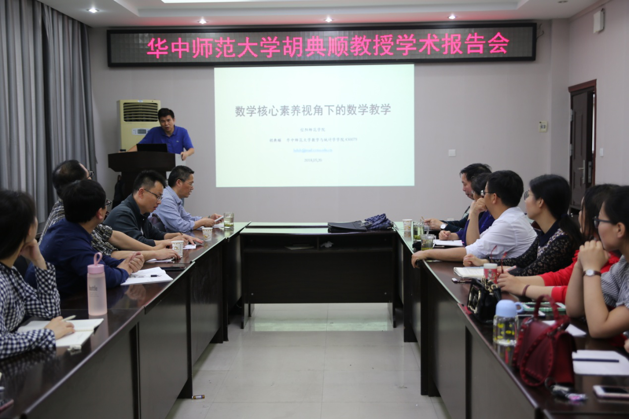 2018年5月20日下午,应数学与统计学院邀请,华中师范大学胡典顺教授在数学学院学术报告厅作了题为“数学核心素养视角下的数学教学”的学术报告。报告会由数学与统计学院副院长蔡礼明教授主持,该院部分校外指导教师和学院青年教师、研究生聆听了此次报告。
