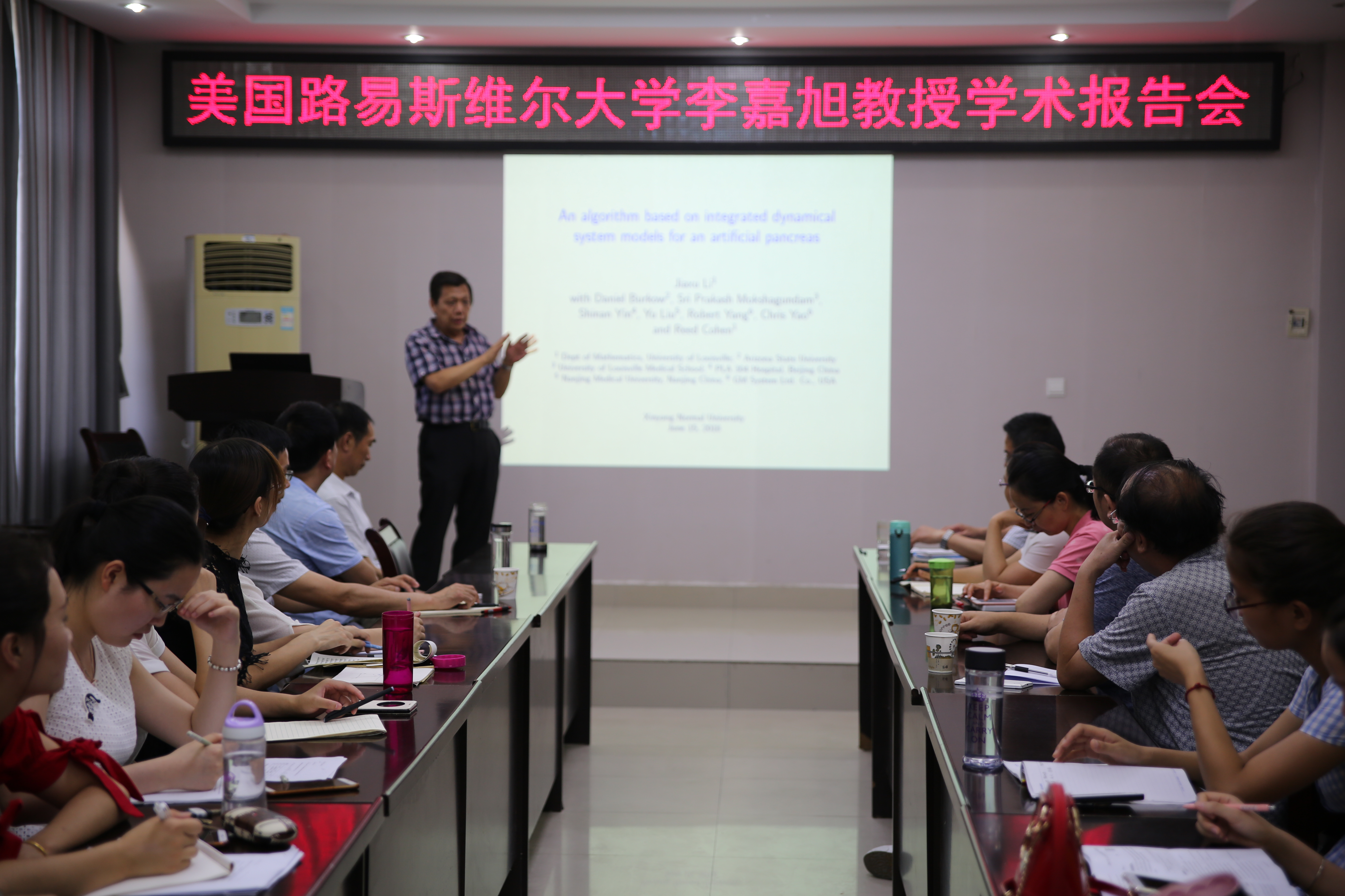 2018年6月15日下午,应数学与统计学院邀请,美国路易斯维尔大学博士生导师李嘉旭教授在数学与统计学院学术报告厅作了题为“An algorithm based on integrated dynamical systems for an artificial pancreas”的学术报告。报告会由数学与统计学院副院长蔡礼明教授主持,该院部分教师和研究生聆听了此次报告。