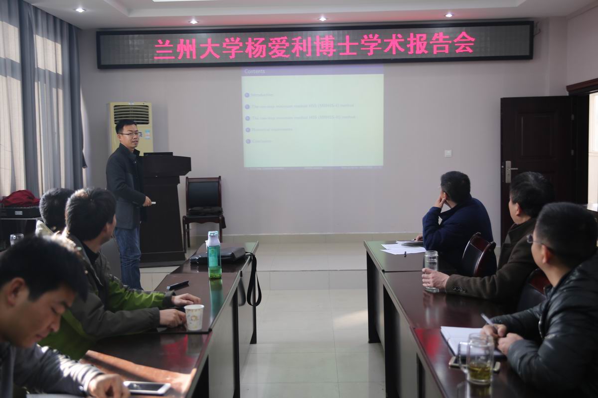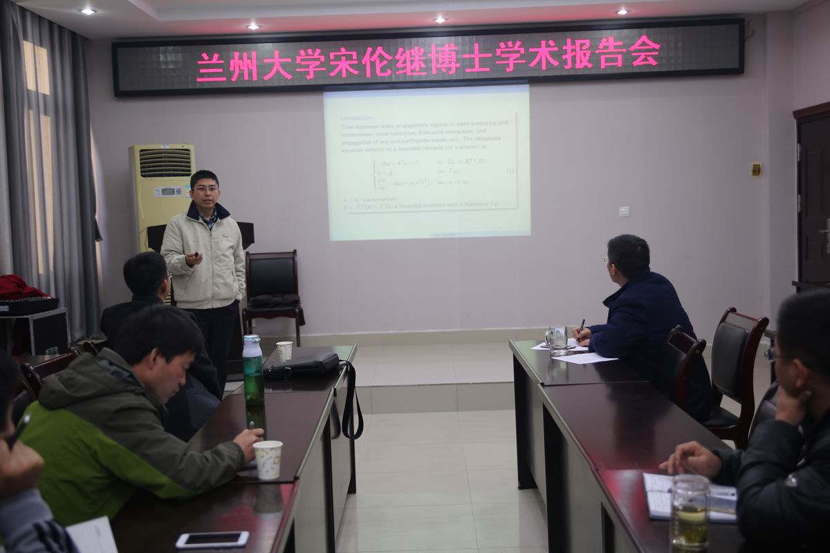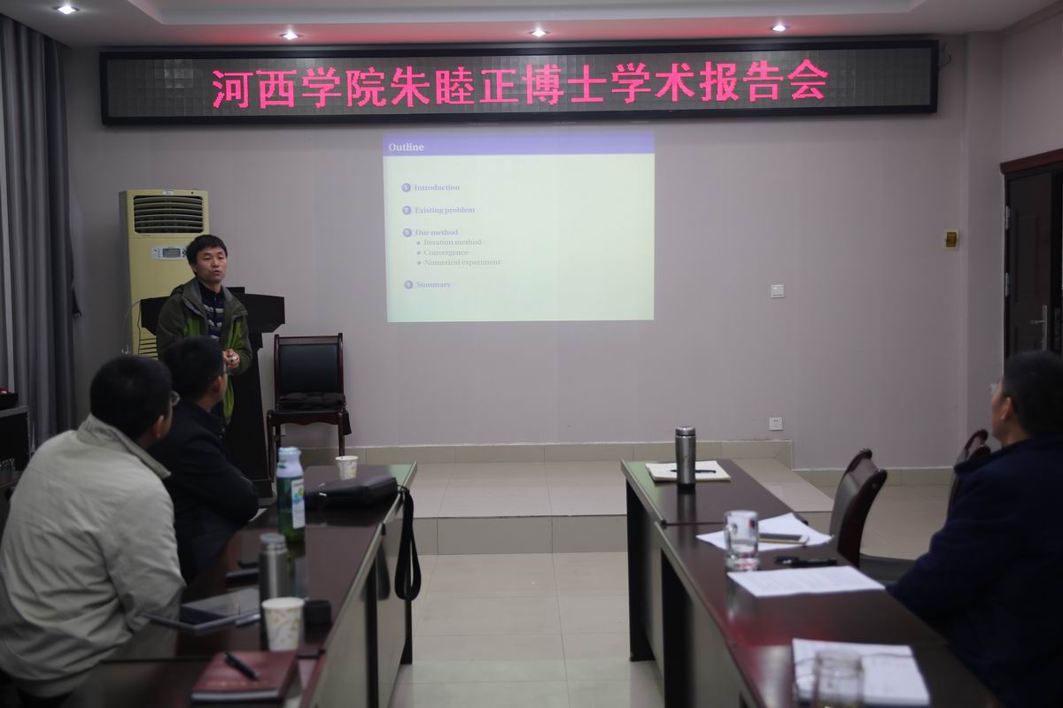 12月16日下午,应数学与统计学院邀请, 兰州大学宋伦继博士、杨爱利博士和河西学院朱睦正博士在数学与统计学院学术报告厅分别作了题为“A Multi-Domain Spectral IPDG Method for Helmholtz Equation with High Wave Number”、 “Minimum residual Hermitian and skew-Hermitian splitting iteration methods for non-Hermitian positive definite linear systems”、 “On HSS-based sequential two-stage methods for non-Hermitian saddle point problems”的学术报告. 数学与统计学院部分教师及研究生聆听了报告。 报告会由数学与统计学院副院长蔡礼明教授主持。