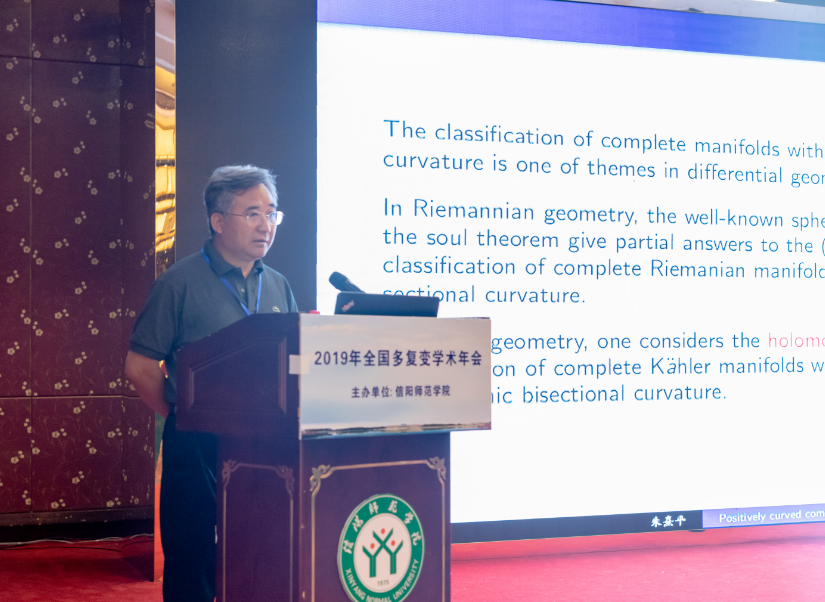 8月20日,会议特邀报告由同济大学陈志华教授主持,中山大学朱熹平教授,作了题目为《Positively curved complete noncompact Kähler manifolds》的报告。主要研究了流形具有非极大体积增长情形下的单值化猜想,证明在极小体积增长情形下第一陈数的有限性。特别地,部分解决了具有极小体积增长的复2维凯勒流形上的单值化猜想。