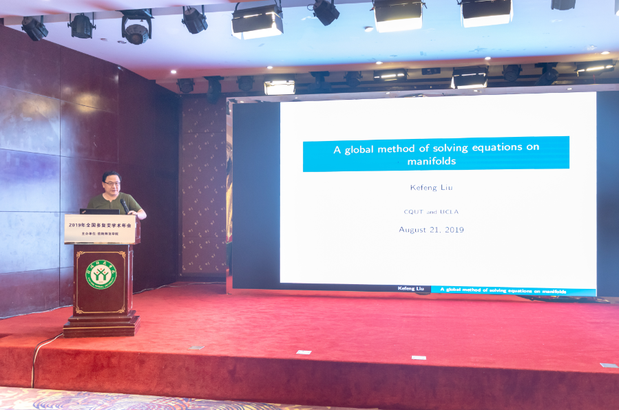 8月21日上午,会议特邀报告由中国科学院院士周向宇主持。加州大学洛杉矶分校刘克峰教授作了题目为《A global method on solving equations on complex manifolds》的报告。他在流形上引入了对应的整体算子,用来研究凯勒流形上复结构的变分。进一步,利用完备凯勒流形中这类算子,构造了全纯典则形式在复结构的整体变分下以及在其模空间上的闭公式。作为该方法的应用他给出了一个简单的求解一般 Belrtami 方程以及复结构形变问题中Kuranishi 阻碍方程的新方法,对后一问题的求解解决了 Kodaira 的一个公开问题。