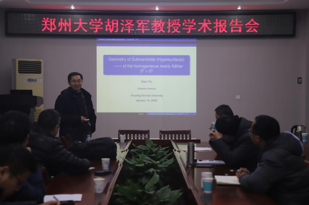1月14日上午,应数学与统计学院邀请,郑州大学胡泽军教授和郭向前教授在学院学术报告厅分别作了题为“Geometry of submanifolds in the nearly Kaehler”和“A class of sld+1 modules from Witt algebra modules”的学术报告,报告会由数学与统计学院副院长蔡礼明教授主持,学院部分老师和研究生聆听了此次报告。