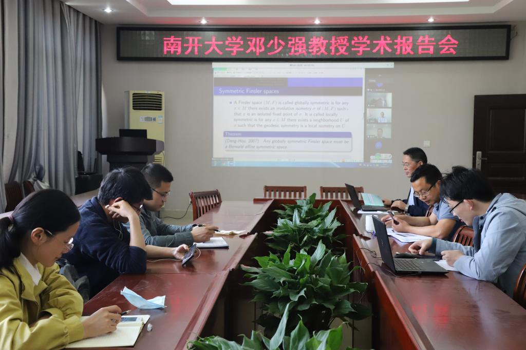 在报告中,邓少强教授首先介绍了有关黎曼-芬斯勒空间对称性的最新结果;其次,阐述了仿射对称Berwald空间,局部对称Finsler空间,全局对称Finsler空间等;最后,邓教授证明了在弱对称空间和全局对称空间之间没有中间阶段。在报告结束后,邓教授与师生们进行了深入探讨与交流,使大家对芬斯勒空间有了进一步的认识。邓少强教授的这场报告为数学与统计学院在疫情期间不间断进行学术交流活动开启了序幕。