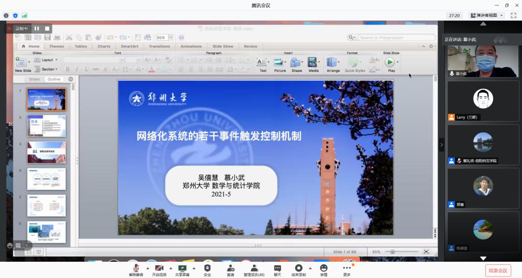 5月17日上午,应数学与统计学院邀请,郑州大学慕小武教授通过腾讯会议平台做了一场题为《网络化系统的若干事件触发控制》的在线学术报告。报告会由数学与统计学院党委书记王娟主持,学院部分老师和研究生聆听了此次报告。