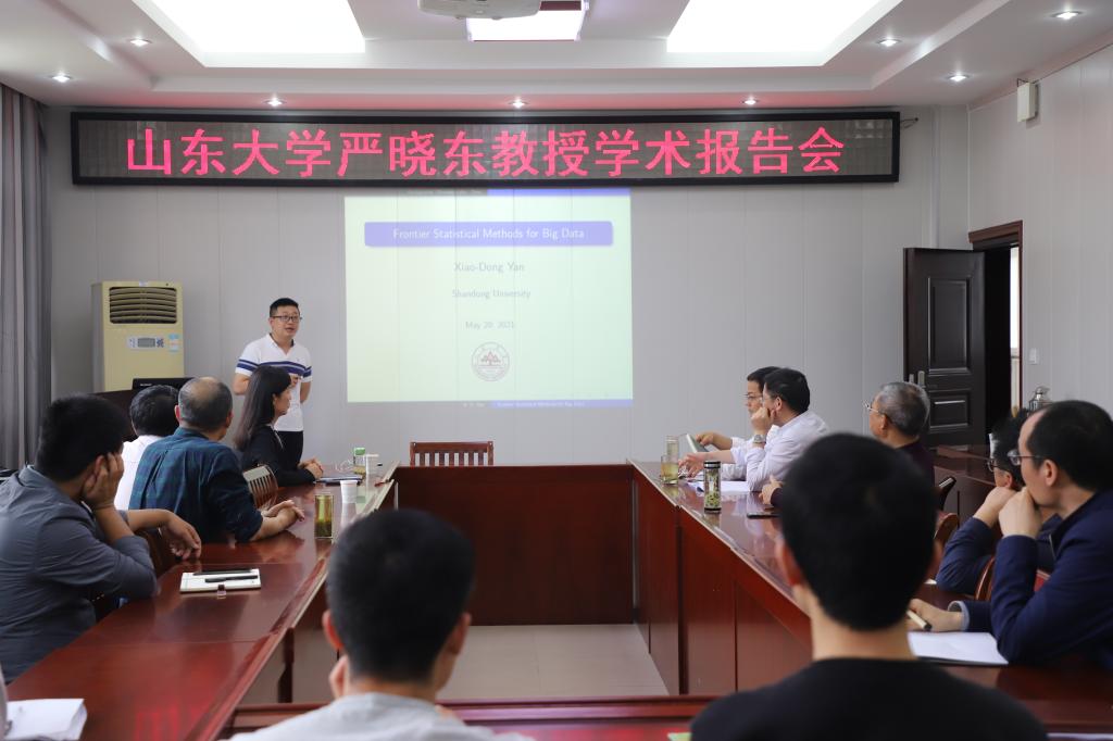 5月21日下午,应数学与统计学院邀请,山东大学严晓东教授在数学与统计学院学术报告厅做了一场题为《大数据统计学前沿方法介绍》的学术报告。报告会由数学与统计学院副院长蔡礼明主持,学院院长胡余旺、书记王娟、副院长陈越奋和部分老师、研究生聆听了此次报告。