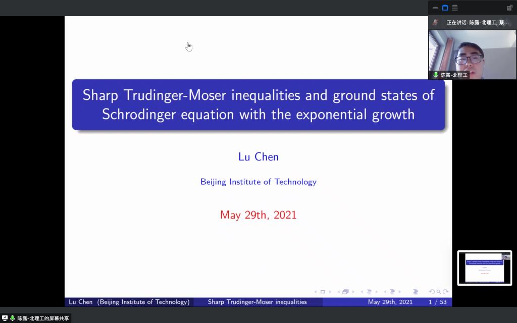 在报告中,陈露博士首先对trudinger moser不等式的研究历史进行一次回顾总结;其次,介绍了他们最近关于尖锐的Trudinger-Moser不等式的结果;最后,陈博士研究了具有临界指数增长的Schrodinger方程的基态解的存在性。报告结束后,陈露博士针对师生们提出的问题给出了详细的解答,并与在线的师生就报告内容进行了热烈的讨论。