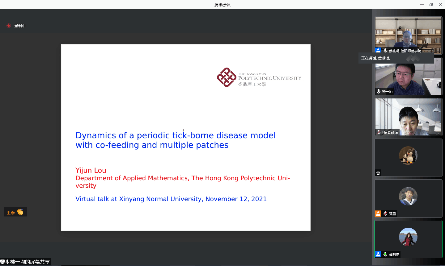 11月12日上午,应数学与统计学院邀请,香港理工大学楼一均博士通过腾讯会议平台为我院研究生及相关研究方向老师作了题为《Dynamics of a periodic tick-borne disease model with co-feeding and multiple patches》的学术报告。报告会由数学与统计学院信息与计算科学系主任黄明湛副教授主持。