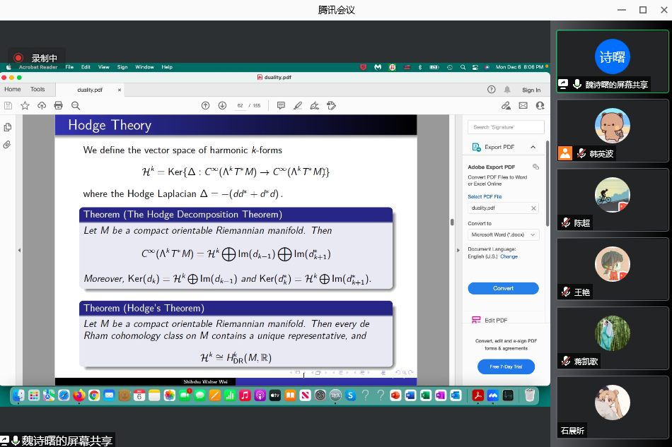 12月7日上午,应数学与统计学院邀请,美国俄克拉荷马大学魏诗曙教授通过腾讯会议平台在线作了题为《Unifications of dualities in mathematics from tradition to contemporary with a harmonic viewpoint》的学术报告,学院部分老师和研究生聆听了此次报告。报告会由数学与统计学院副院长韩英波教授主持。