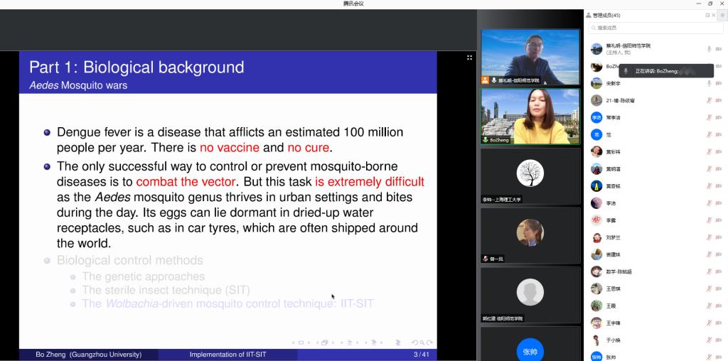 12月19日下午,应数学与统计学院邀请,广州大学郑波教授通过腾讯会议平台在线作了题为《Mosquito suppression models consisting of two sub-equations switching each other》的学术报告,学院部分老师和研究生聆听了此次报告。报告会由数学与统计学院院长蔡礼明教授主持。