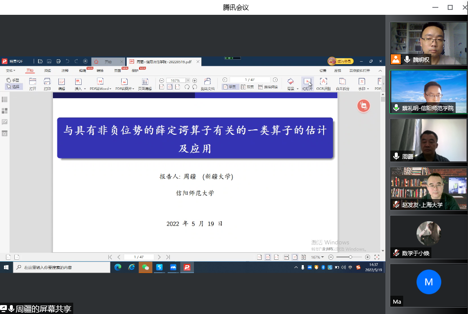 5月19日下午,应数学与统计学院邀请,新疆大学周疆教授通过腾讯会议平台在线作了题为《Two-weight norm inequalities for some fractional type operators related to Schrödinger operator on weighted Morrey spaces》的学术报告,报告会由数学与统计学院院长蔡礼明教授主持,学院部分老师、研究生和该领域相关博士聆听了此次报告。