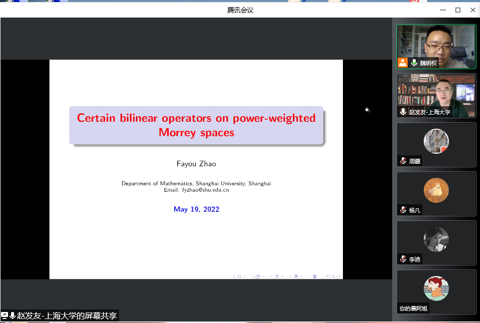 5月19日下午,应数学与统计学院邀请,上海大学赵发友教授通过腾讯会议平台在线作了题为《Certain bilinear operators on power-weighted Morrey spaces》的学术报告,报告会由数学与统计学院院长蔡礼明教授主持,学院部分老师、研究生和该领域相关博士聆听了此次报告。
