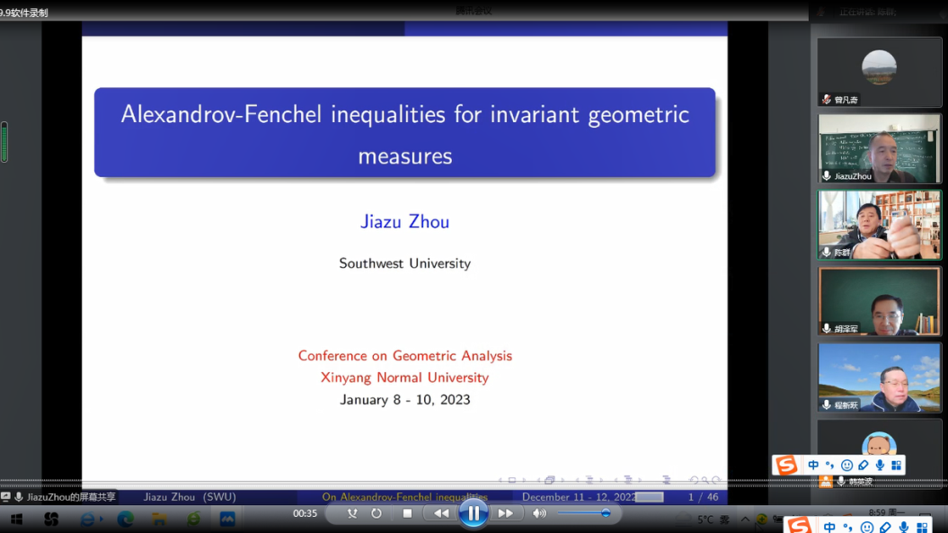 第1场报告由西南大学周家足教授报告,题目为《Alexandrov-Fenchel inequalities for invariant geometric measures》。在报告中,周家足教授讨论了关于不变几何测度(均质积分和平均曲率)的Alexandrov Fenchel不等式。