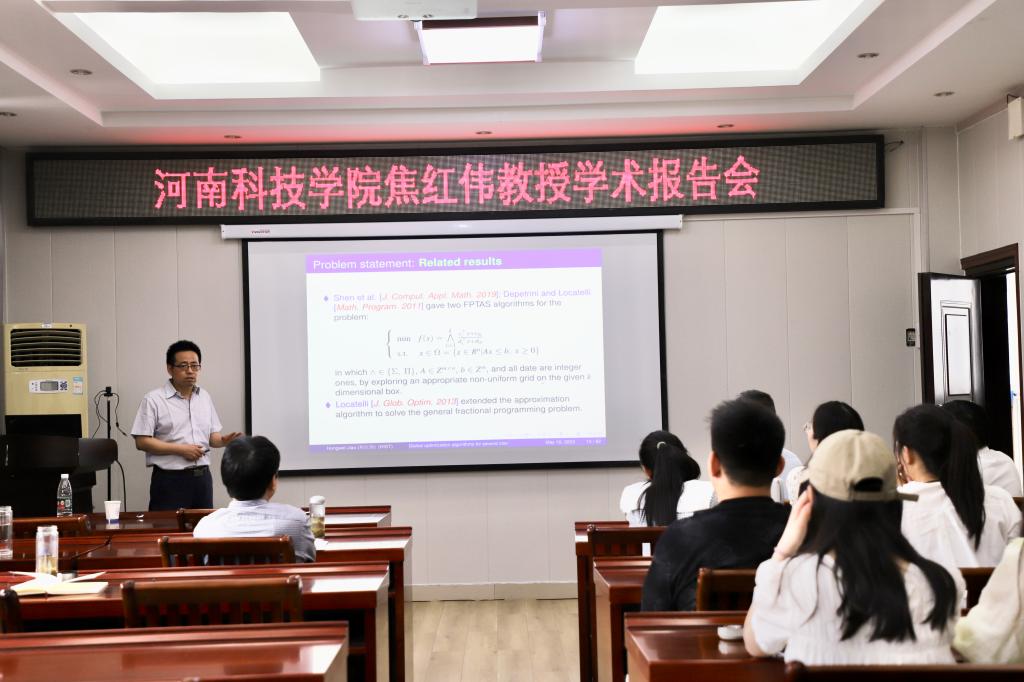 5月16日上午,应数学与统计学院邀请,河南科技学院焦红伟教授在学院报告厅315作了题为“Global optimization algorithms for two classes of nonconvex programming problems”的学术报告。报告会由数学与统计学院副院长韩英波教授主持,部分教师和研究生参加了此次报告会。
