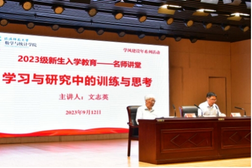 应数学与统计学院邀请, 清华大学文志英教授于9月12日15:00-17:00在理科楼报告厅作了题为“学习与研究中的训练与思考”的讲座。 报告会由数学与统计学院院长蔡礼明教授主持,学院副书记刘丰铭,新生班主任和2023级全体同学参加了此次讲座。