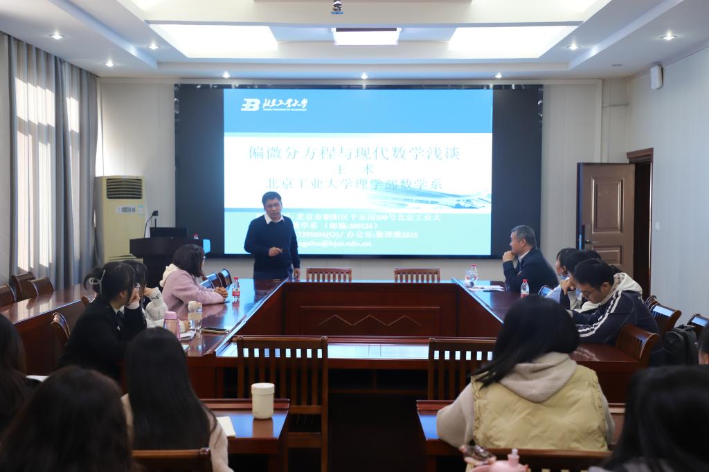 1117午,应数学与统计学院邀请,北京工业大学王术教授在数学与统计学院315会议室做了一场题为《偏微分方程与现代数学浅谈》的学术报告。报告由数学与统计学院副院长韩英波教授主持,部分老师、研究生和本科生聆听了此次报告。
