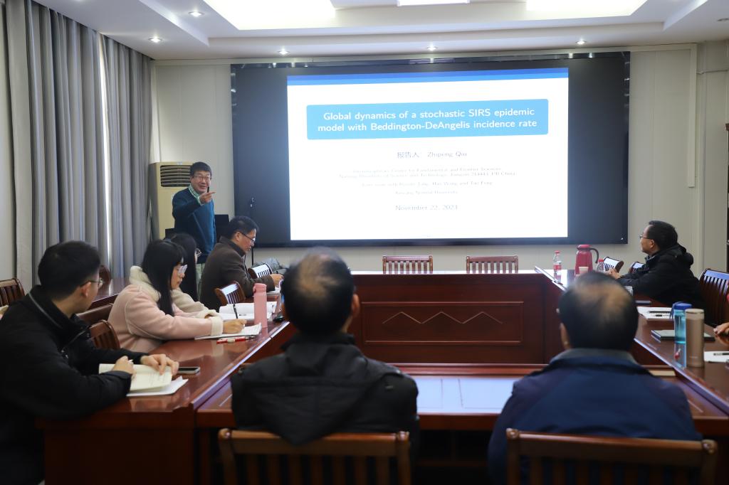 11月25日上午,应数学与统计学院邀请,南京理工大学邱志鹏教授教授在数学楼315报告厅为我校师生做了题为“Global dynamics of a stochastic SIRS epidemic model with Beddington - DeAngelis incidence rate”的学术报告,数学与统计学院生物团队教师和全体研究生在场聆听了报告,报告由数学与统计学院王霞教授主持。