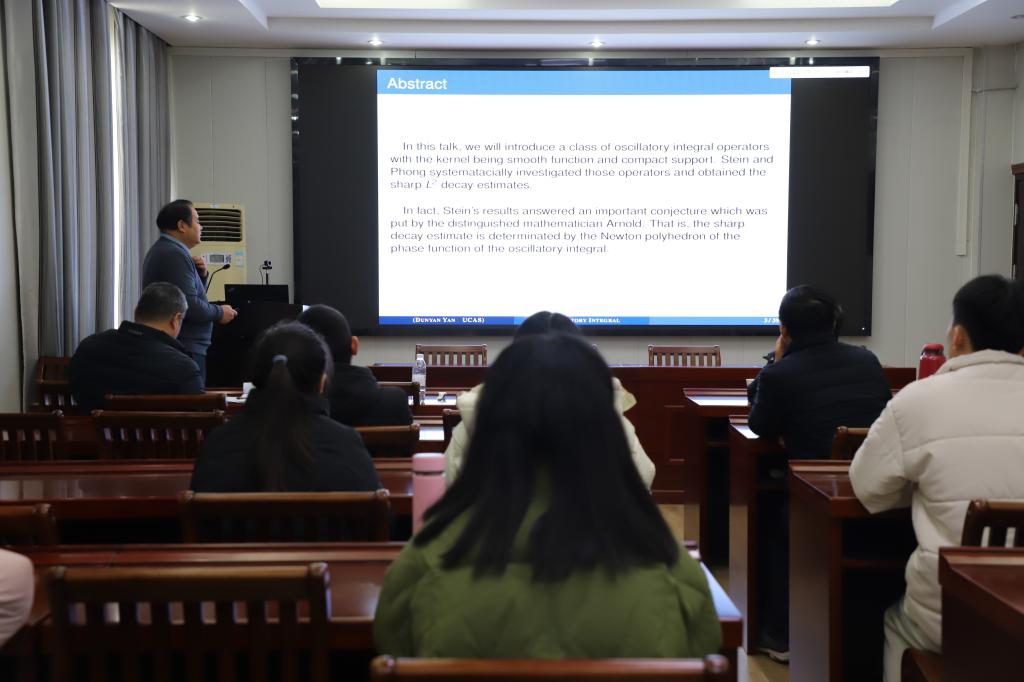1月8日上午,应数学与统计学院邀请,中国科学院大学燕敦验教授在数学楼315会议室做了题为《Oscillatory Integral and Newton Polyhedron》的学术报告。报告会由院长蔡礼明教授主持,副院长韩英波教授、部分老师及研究生聆听了此次报告。