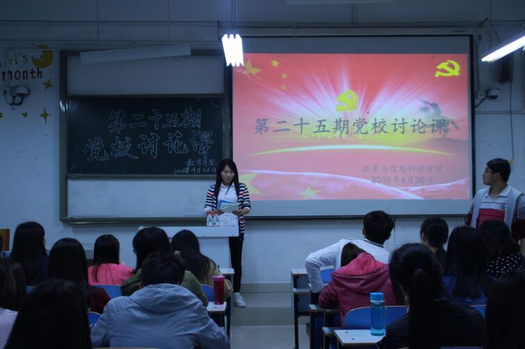 为进一步加强党员发展对象的党性教育,促进思想交流,4月26日晚,数学学院第二十五期党校讨论课在数学楼104教室成功举行,共有32名入党积极分子参加了此次讨论课。