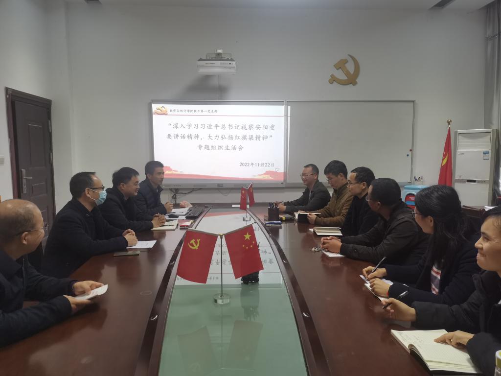 为深入学习宣传贯彻党的二十大精神、习近平总书记视察河南安阳重要讲话精神,按照学校党委有关要求,数学与统计学院党委精心谋划、周密部署,分别于11月21日-25日,先后组织9个党支部召开大力弘扬红旗渠精神专题组织生活会,会议通过线上线下相结合的方式进行。