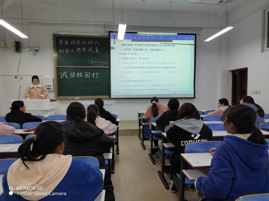 为了加强大学生诚信教育,金融基础知识教育,国家助学贷款及其他资助政策宣传教育,同时为了推动国家助学贷款和其他资助工作的持续开展,数学与统计学院特举办“诚信校园行”知识竞赛初赛。本次初赛于11月26日晚,在数学与统计学院102教室拉开序幕。