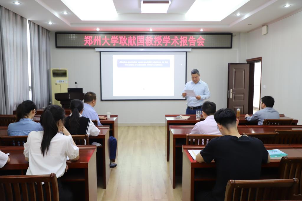 2023年4月19日下午,应数学与统计学院邀请,郑州大学耿献国教授在学院学术报告厅作了题为“Algebro-geometric quasi-periodic solutions to the hierarchy of extended Volterra lattices”的报告。报告会由数学与统计学院副院长韩英波教授主持,我院部分老师和本科生聆听了这次报告。