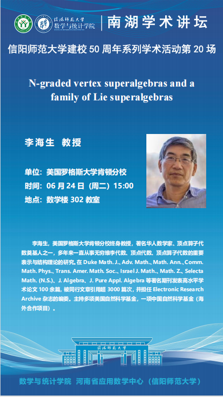 庆建校50周年之南湖讲坛:美国罗格斯大学肯顿分校李海生教授——N-graded vertex superalgebras and a family of Lie superalgebras