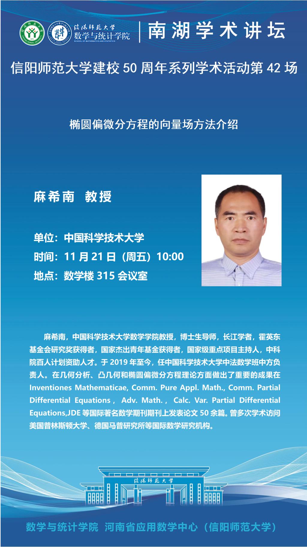 庆建校50周年之南湖讲坛:中国科学技术大学麻希南教授——椭圆偏微分方程的向量场方法介绍